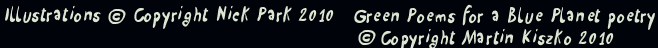 Intellectual Property. All intellectual property rights in and relating to the Greenpoemsforablueplanet.com website is owned by Martin Kiszko and Nick Park. It is easy to copy material which appears on web-sites, but it is not legal. Therefore, no-one may copy, distribute, show in public or create any derivative work from the website content. Any copying or performance must seek prior permission from the authors and publisher.